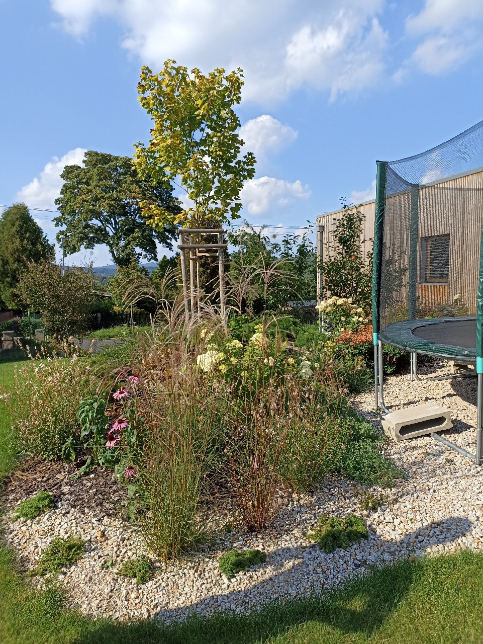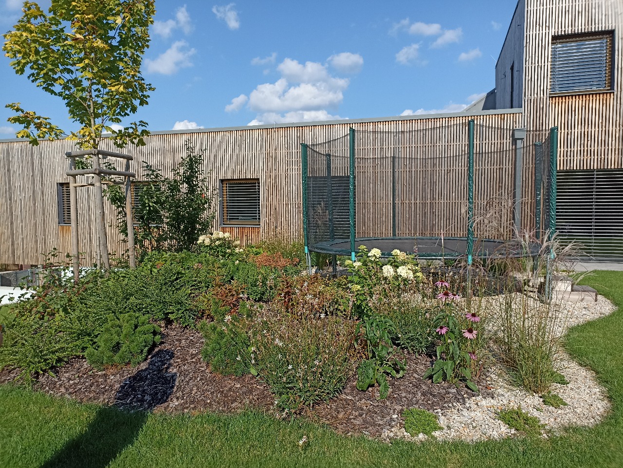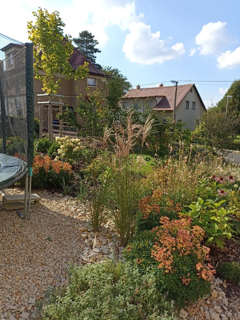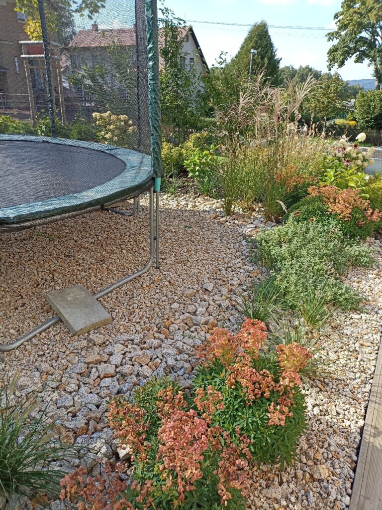 Zahrada v Liberci byla navržena tak, aby spojovala estetiku s praktickým využitím pro celou rodinu. Dominantou prostoru je zapuštěná trampolína, která přirozeně zapadá do okolní zeleně. Kombinace okrasných výsadeb, trávníku a odpočinkové zóny vytváří harmonické prostředí, kde se mohou potkávat děti i dospělí a společně si užívat čas venku.